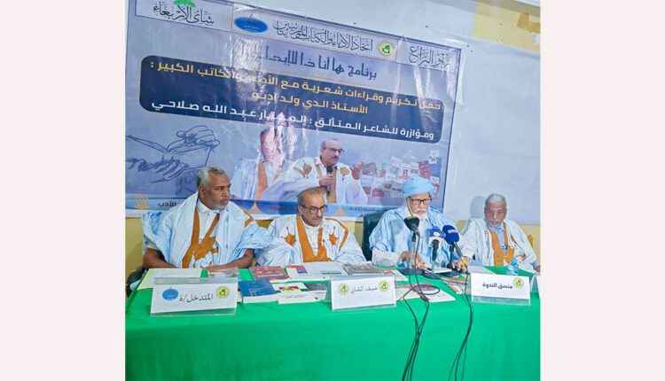 نظم اتحاد الأدباء والكتاب الموريتانيين، ندوته الأسبوعية “شاي الأربعاء” في مقره في نواكشوط، لتكريم الشاعر أدي ولد آدبه، ومؤازرة ممثل موريتانيا في مسابقة أمير الشعراء الشاعر المختار ولد عبد الله.