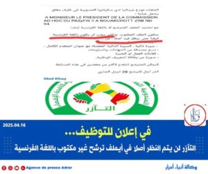 وتأتيك تآزر بصوت مبحوح عائد من التاريخ، لا يعرف أحد، مقررة عدم نظرها في أي طلب لا يقدم بالفرنسية، متجنبة على الدستور، الذي فيه أن العربية هي اللغة الرسمية للبلاد، ومبدية ضعفا إداريا غريباً، إذ لا توجد إدارة في موريتانيا لا يمكنها قراءة العربية، وتوفير من يقرأ العربية، ومتجنيةً على شعب بأكمله، ومجانبة الصواب، بإقصائها لآلاف الطلاب المتخرجين من النظام التربوي والعلمي الوطني.